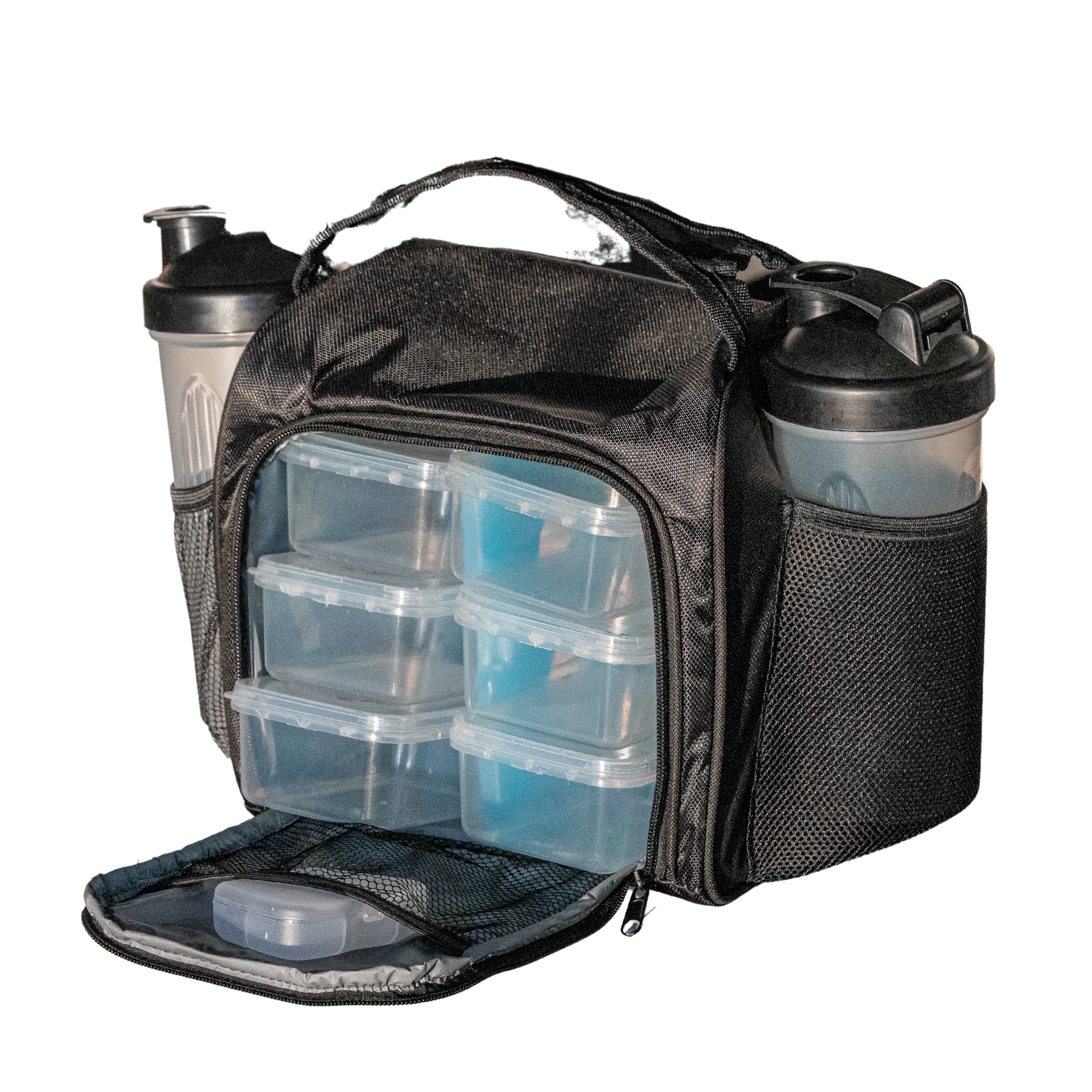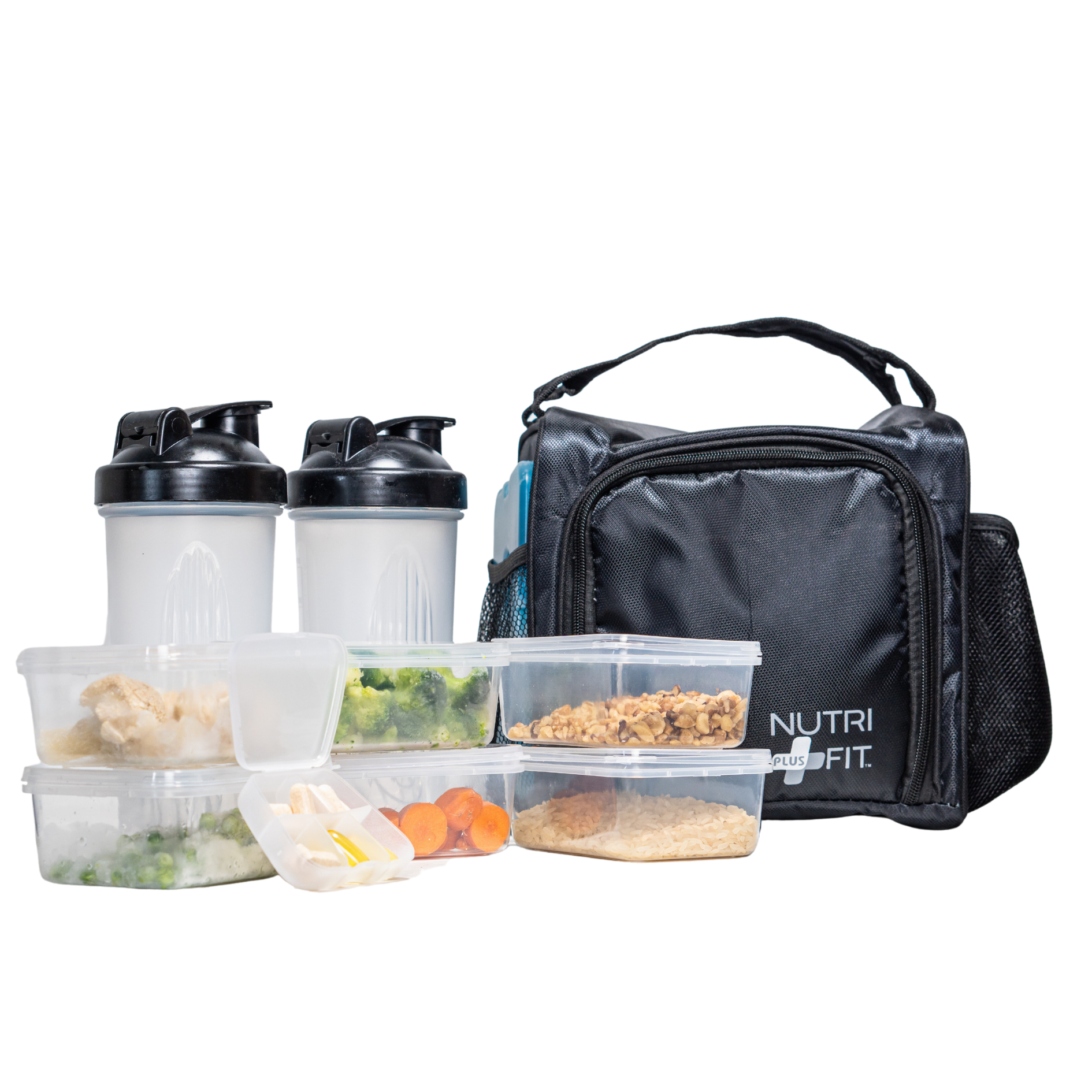 NUTRIFIT Meal Prep Bag keeps your meals fresh throughout the day with thick insulated walls. This complete system includes 6 food containers, 2 protein shakers, an ice gel pack, and a vitamin carrier—everything you need to stay on track with your nutrition goals. Dishwasher and microwave safe containers make cleanup easy, while exterior and interior pockets hold your essentials. Perfect for portion control and saving money on daily meals.