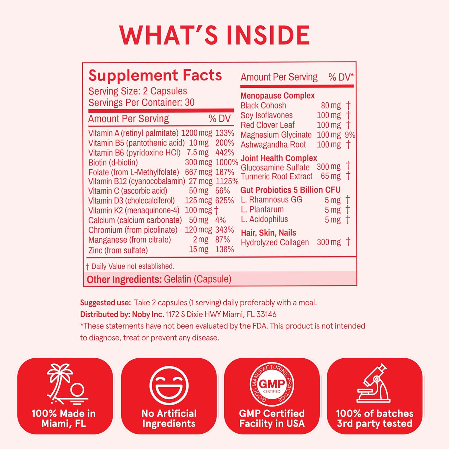 Peach Perfect Menopause Multivitamin is a comprehensive 21-in-1 formula specifically designed for women aged 45 and over navigating menopause. This all-in-one supplement combines essential vitamins, minerals, and targeted nutrients to simplify your wellness routine. The specialized Menopause Complex features Black Cohosh, Soy Isoflavones, Red Clover Leaf, Magnesium Glycinate, and Ashwagandha Root—ingredients chosen to address the unique needs of this life stage. Additionally, it includes Glucosamine Sulfate and Turmeric Root Extract for joint and gut health support, plus a beneficial probiotic blend. One convenient daily dose replaces multiple supplements, helping you feel supported through this important transition.